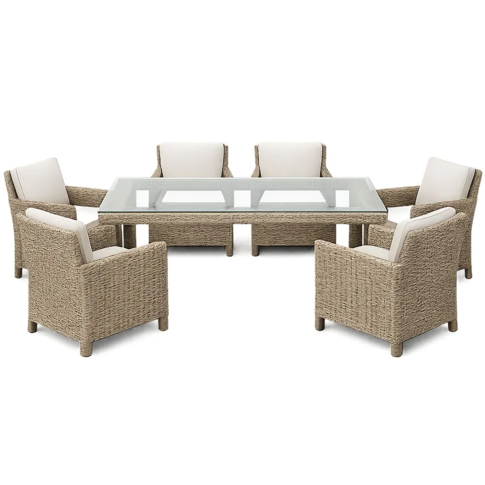 Garten-Essgruppe aus Rattan und Aluminium mit Glastisch und 6 Sesseln in Beige und Creme