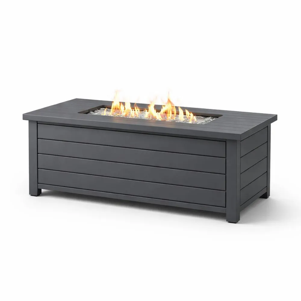 Der Hauptkörper des Feuertisches besteht aus Aluminium, während die Feuerstelle aus gehärtetem Glas gefertigt ist. Der Tisch misst 135 cm in der Länge, 68 cm in der Breite und 50 cm in der Höhe.