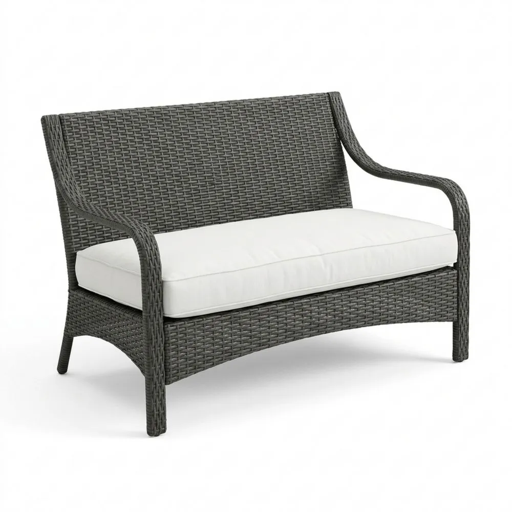 Outdoor-2-Sitzer-Sofa aus Polyrattan in Grau mit weißen Kissen