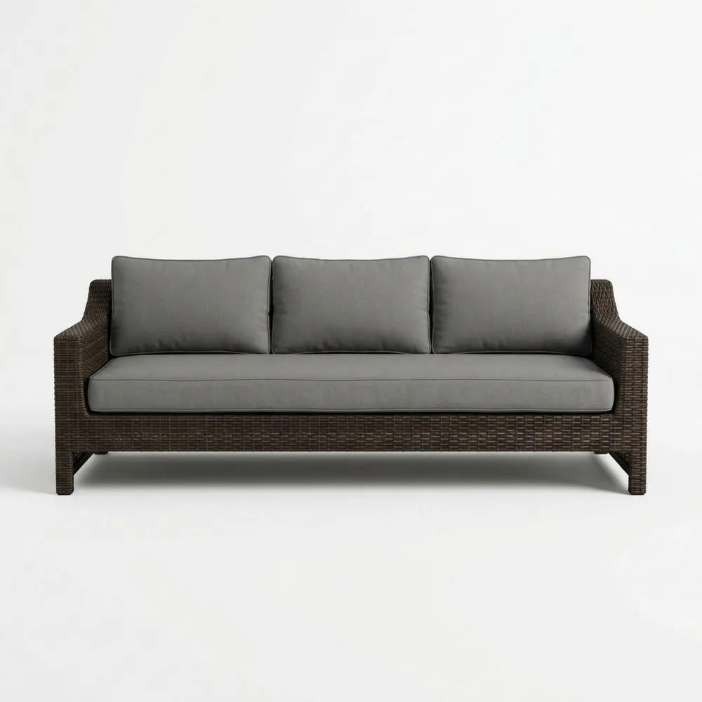 Ein 3-Sitzer Sofa mit einem Gestell aus Polyethylen-Rattan. Die Sitz- und Rückenkissen sind mit Polyester bezogen und bieten Platz für drei Personen. Die Kissen sind in einem neutralen Grauton gehalten. Die Konstruktion ist wetterfest.