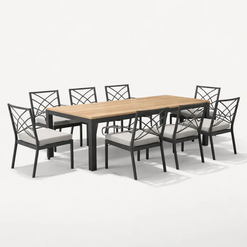 Outdoor-Essgruppe aus massivem Eichenholz mit Tisch und 8 Stahlstühlen mit Kissen