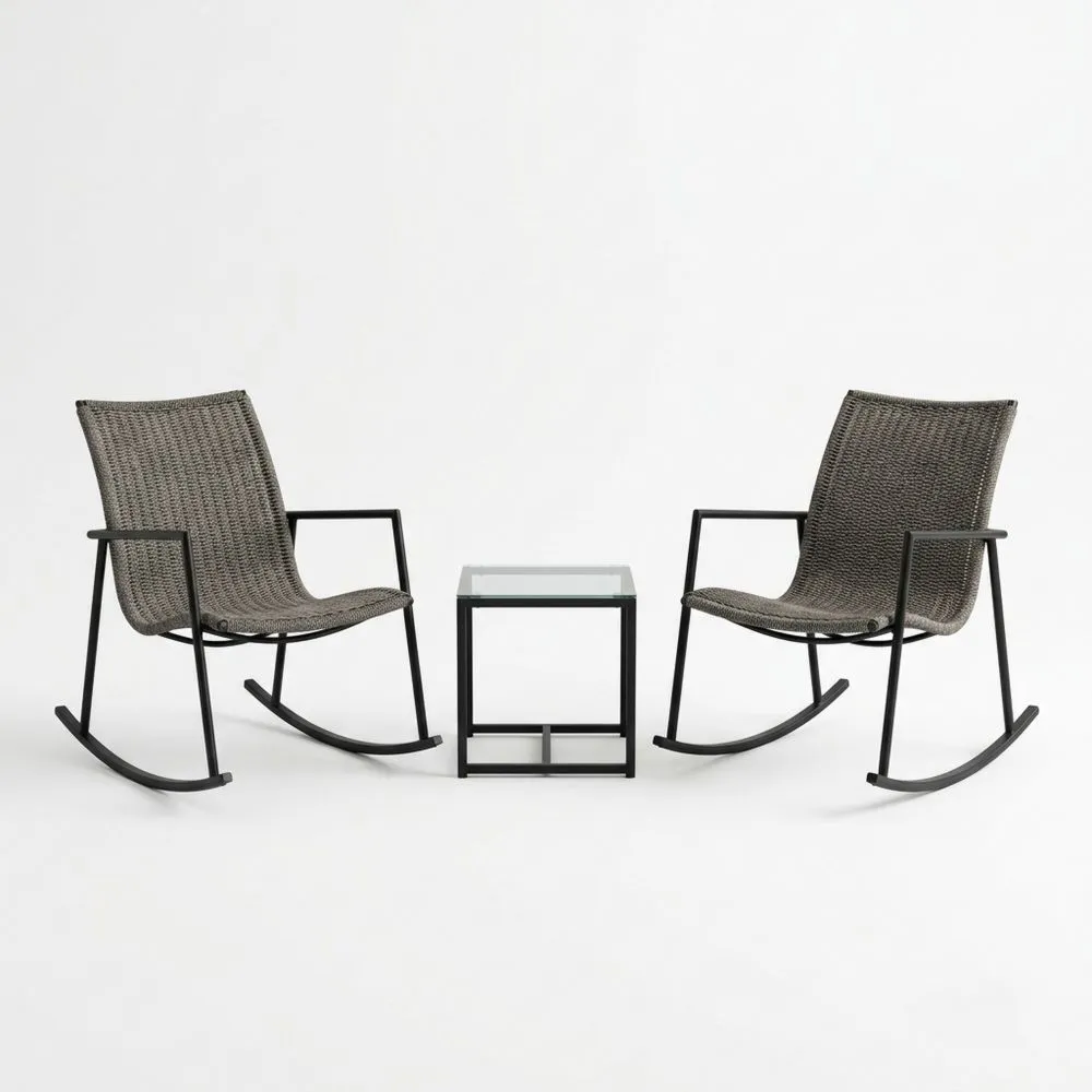 Outdoor-Tisch- und Stuhl-Set 2er-Set mit Schaukelstühlen und Beistelltisch aus Rattan und Stahl in Grau/Schwarz