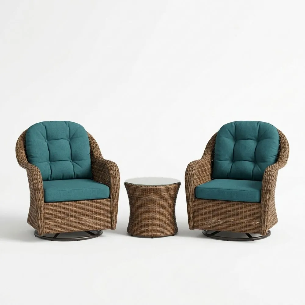 Dieses Set besteht aus zwei Sesseln und einem Tisch. Der Rahmen der Sessel ist aus synthetischem Rattan gefertigt, während die Tischplatte aus 8 mm dickem gehärtetem Glas besteht. Die Sitz- und Rückenkissen sind mit Polyester gefüllt und mit einem wasserabweisenden Polyestergewebe bezogen.