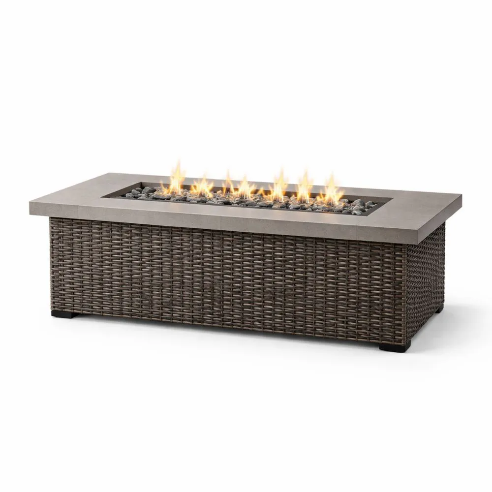 Rechteckiger Gas-Feuertisch aus Polyrattan mit Betonoberfläche, Grau, 140 × 70 × 50 cm (L × B × H)