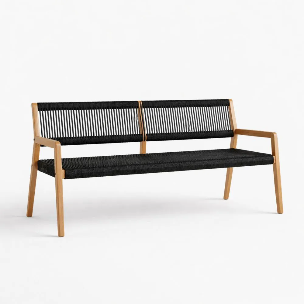 Teakholz-Gartenbank mit Polyester-Seilgeflecht in Schwarz, Gesamtlänge 180 cm